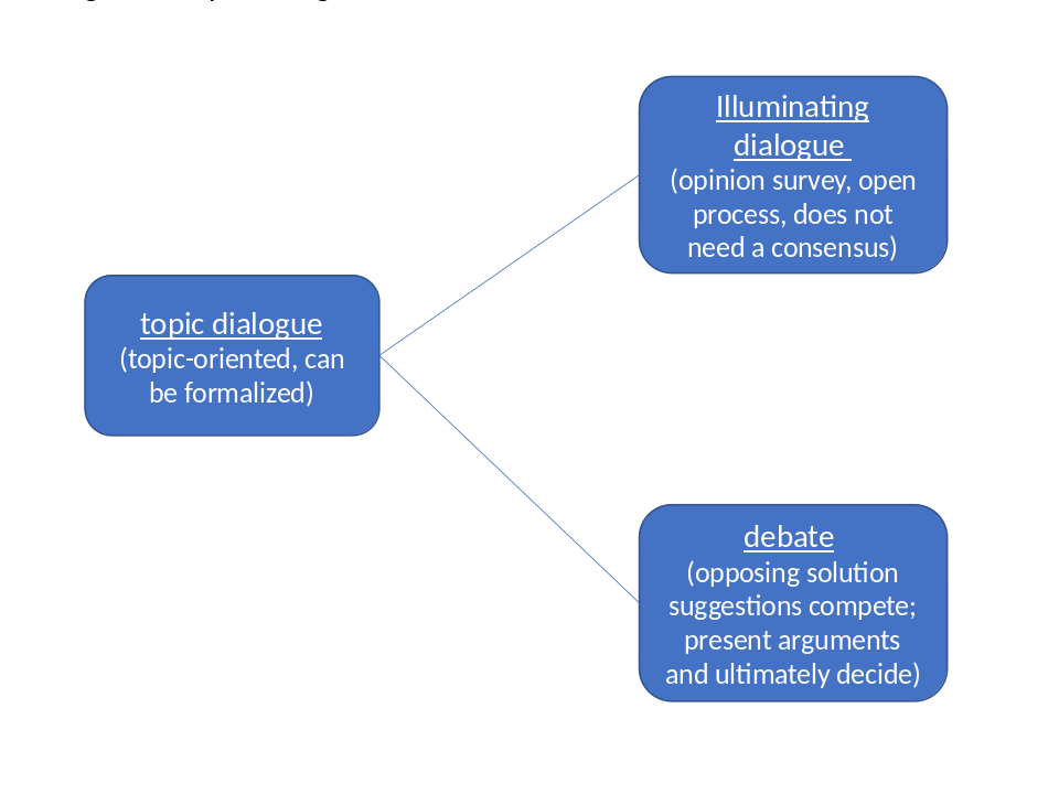 Rhetorical argumentation is based on dialogue, an essential aspect of our social life. Dialogues range from small talk (contact dialogue) to theme discussions (debates), varying in their predictability and formal structures (see graphic 1). To gain an overview, graphics 2 to 4 depict the distinct types of dialogues (Geissner 2001):