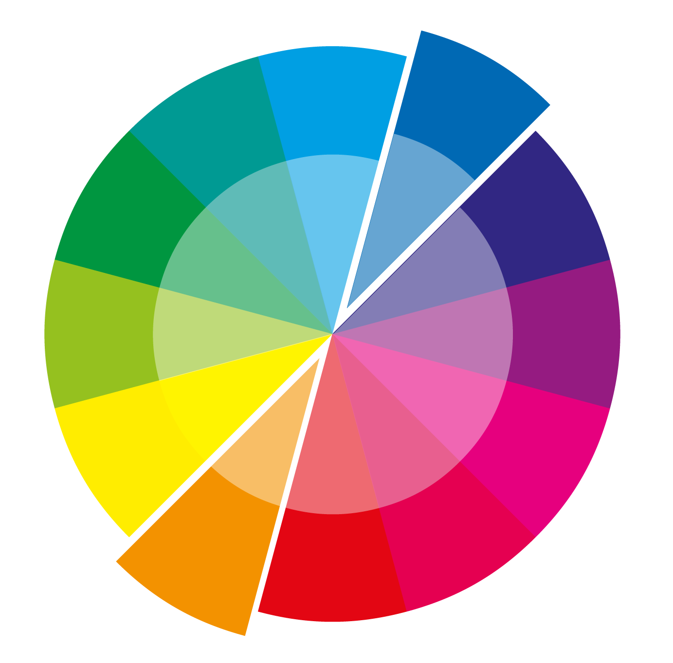 On the colour wheel, complementary pairs of intense and pastel colours are placed opposite each other. Complementary in this case means that the opposites produce the best possible contrast. It is good to select a colour in its pastel shade and to use the corresponding contrasting colour for highlighting.