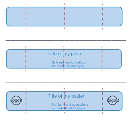 Align the title so that it has the same distance to the top as the addresses have to the bottom (see second figure). Now place the list of authors and their institute address(es). Now possible logos (institute, university, sponsors, etc.) can be placed. | |