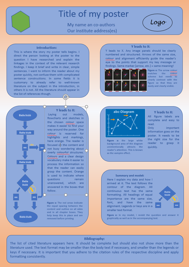 - It looks more professional if boxes of equal importance are the same size or have an easily recognisable, set size ratio. In the sample poster, the two lower right boxes in the body section are half as high as the box on the left, or the same size as the two boxes above.