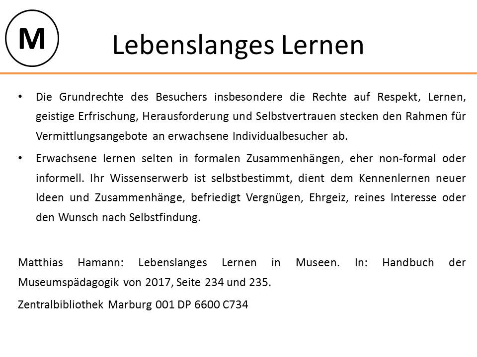 In diesem Fall handelt es sich um eine Lernkartei für den Studiengang Erziehungswissenschaften. Das Teilgebiet ist die Museumspädagogik, dargestellt durch den Kreis mit einem M. Der Titel der Karteikarte ist "Lebenslanges Lernen". Darunter finden sich die Auszüge aus dem Buchtext. Der Titel des Buches, die Seiten auf denen die Textpassagen stehen und der Ort wo das Buch zu finden ist, sind am Ende der Karteikarte notiert.