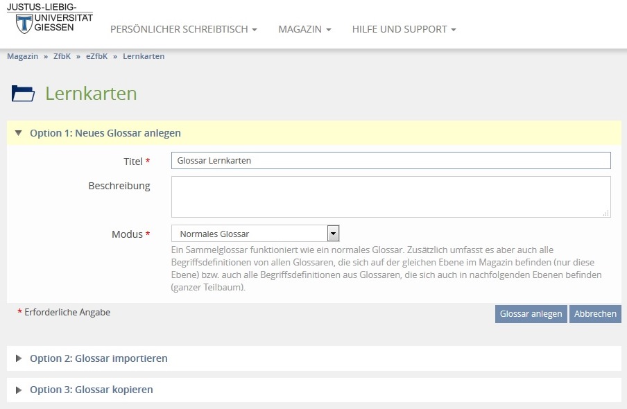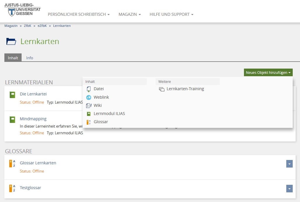 Ihre Lernkarten werden in einem Glossar verwaltet, dass Sie auf ILIAS anlegen.