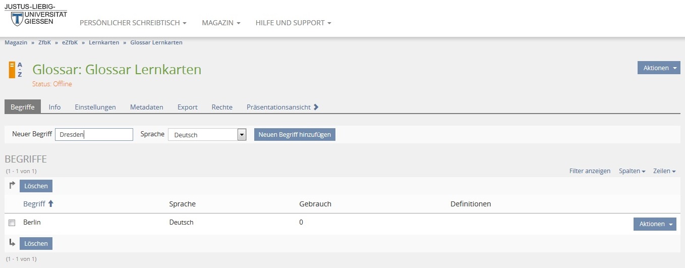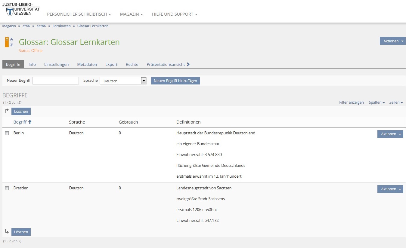 Sind Sie mit dem Ausfüllen Ihrer Lernkarte fertig, dann beenden Sie die Bearbeitung und kehren zur Startseite Ihres Glossars zurück. Dort können Sie weitere Begriffe definieren, also Lernkarten anlegen. Des Weiteren sehen Sie dort eine Übersicht über Ihre Begriffe/Lernkarten (Vorderseite) und deren Definitionen (Rückseite)