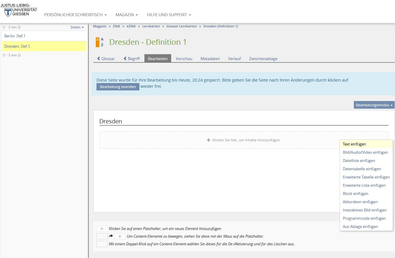Als Beispiel für Lernkarten wurden hier deutschen Städten ausgewählt. Nach der Auswahl des Begriffes, hier "Dresden", werden Sie zum unteren Bildschirm weitergeleitet. Nun können Sie Ihre Lernkartenrückseite gestalten. Hier ist es Ihnen möglich Texte, Tabellen aber auch Bilder und Videos einzufügen.