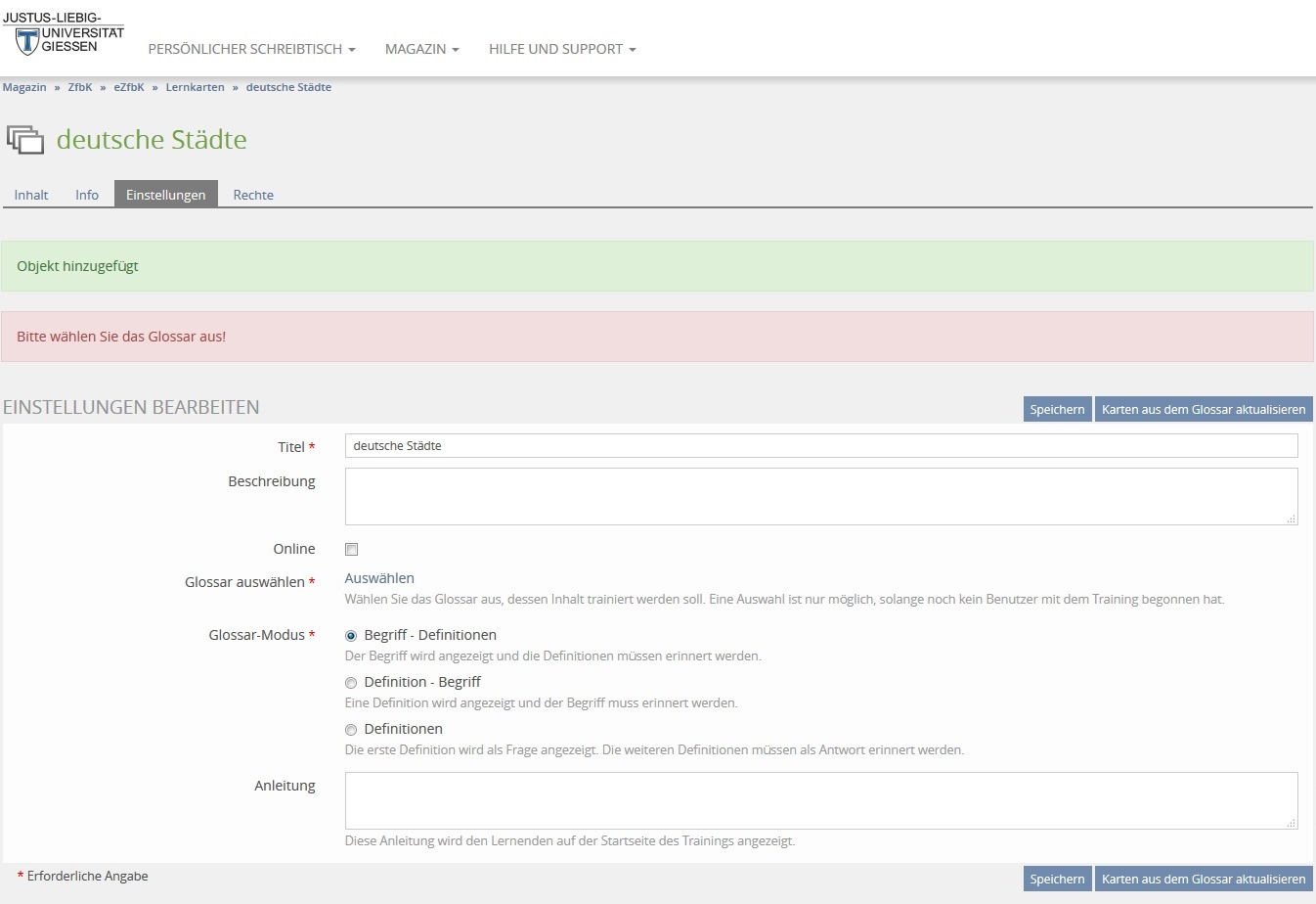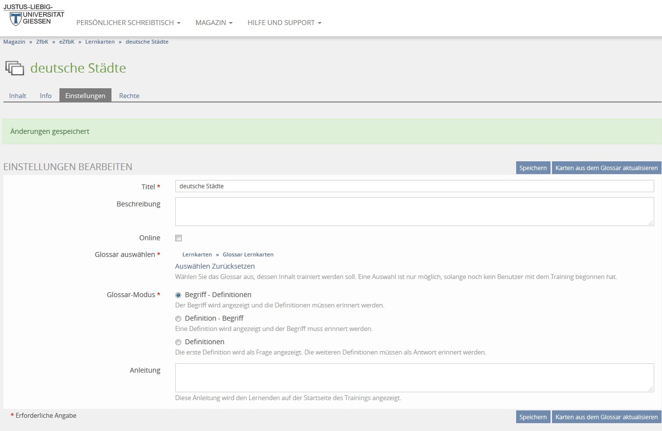 Nur noch ein Klick auf "Speichern" und Ihr Lernkartentraining ist fertig angelegt. Fügen Sie neue Karten Ihrem Glossar hinzu, so müssen Sie Ihr Lernkarten-Training aktualisieren damit diese übernommen werden. Dies erfolgt durch den Button "Karten aus dem Glossar aktualisieren.