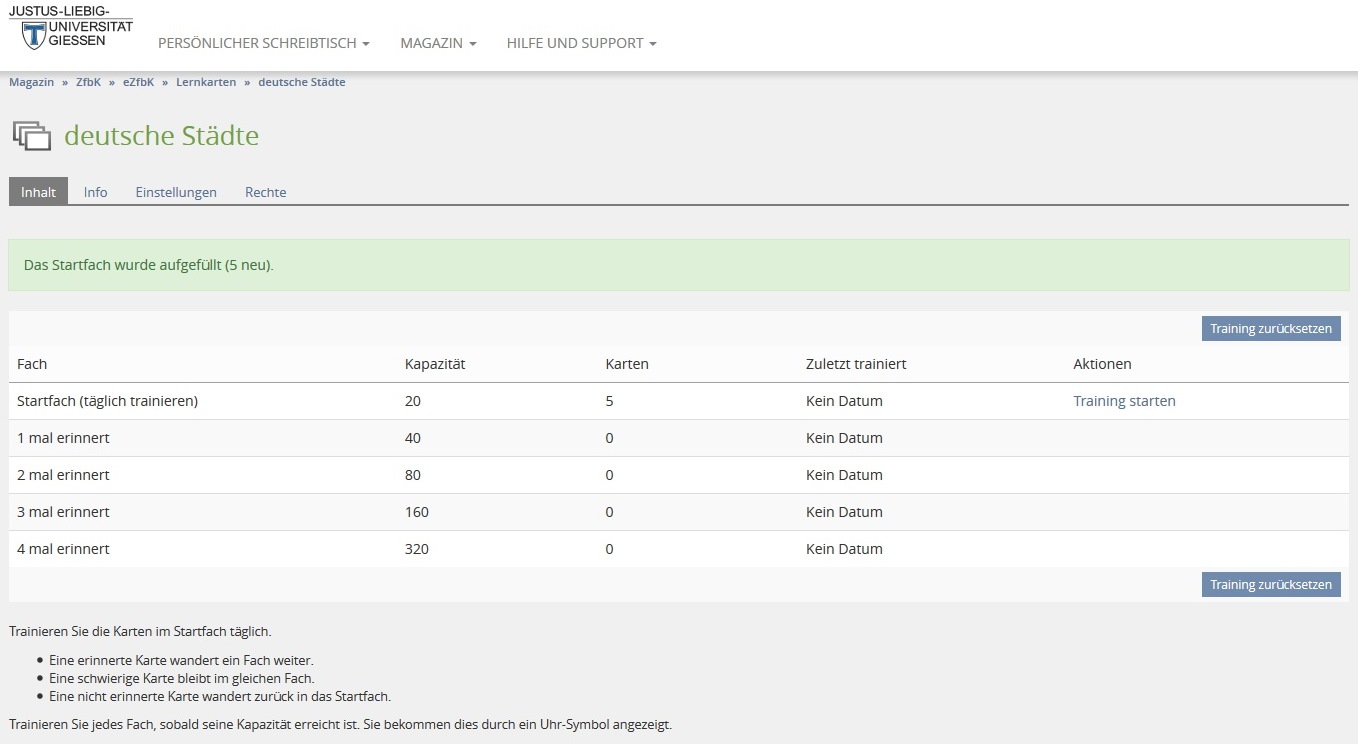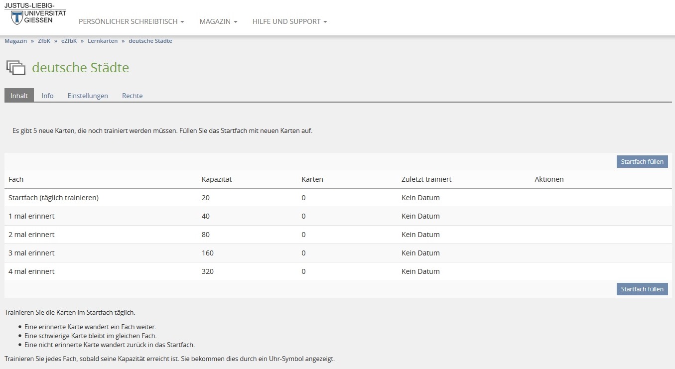 Wenn Sie auf den Button "Startfach füllen" klicken, werden die neuen Lernkarten in das erste Fach, das Startfach, gelegt. Nun können Sie mit dem Lerndurchgang beginnen. Das Startfach sollte täglich trainiert werden. Die Kartenkapazitäten der fünf Fächer sind, wie bei der Lernmaschine in Papierform, unterschiedlich groß.