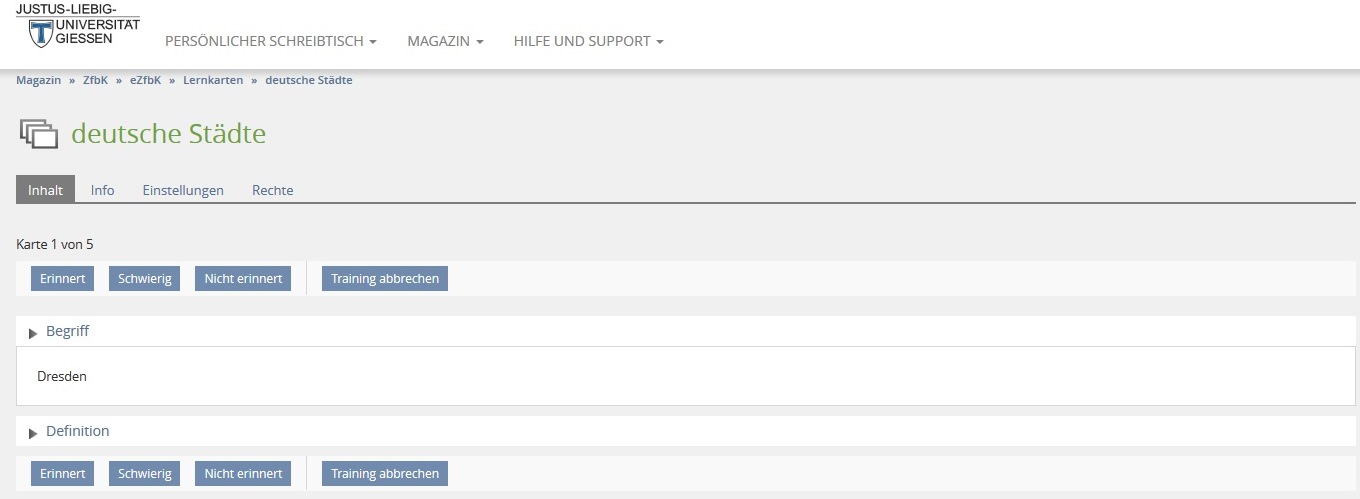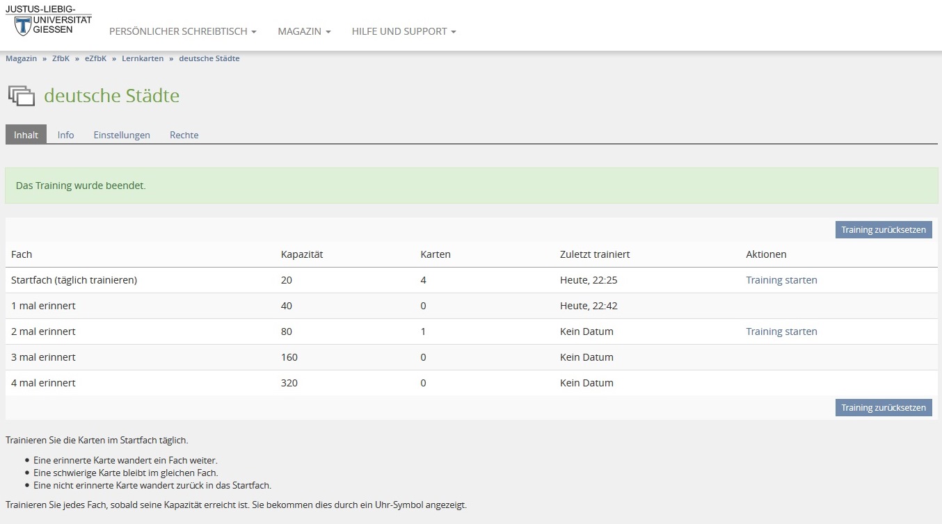 Das Lernkarten-Training ist ein Plugin für die zentrale Lernplattform ILIAS der JLU und basiert auf der Lernmaschine von Sebastian Leitner.