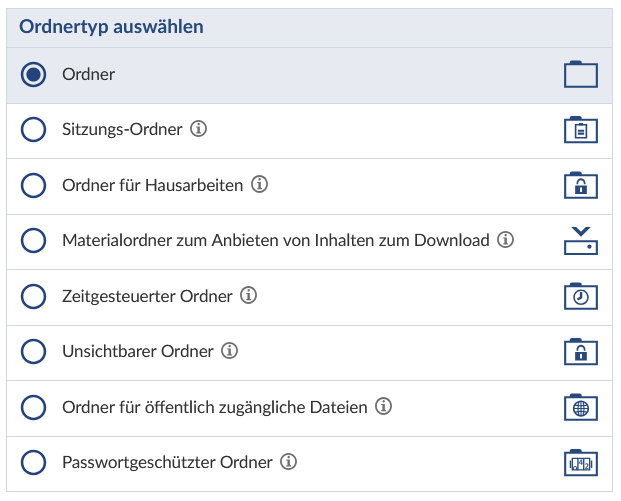 Wenn Sie Ihre Dateien organisieren oder Ordner für unterschiedliche Zwecke (z.B. Ordner für Hausarbeiten, Ordner für Lernmaterialien, Ordner für Gruppenarbeiten) nutzen wollen, können Sie verschiedene Ordnertypen nutzen: