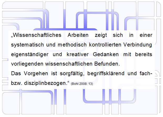 Ein wissenschaftlicher Text entspricht den Kriterien des wissenschaftlichen Handwerks. (vgl. Bohl 2008: 11-13) |