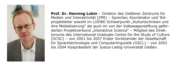 Die Vorlesung wurde per Camtasia aufgezeichnet und kann online angeschaut werden. Bei weiterführendem Interesse kontaktieren Sie bitte den Referenten: henning.lobin@zmi.uni-giessen.de