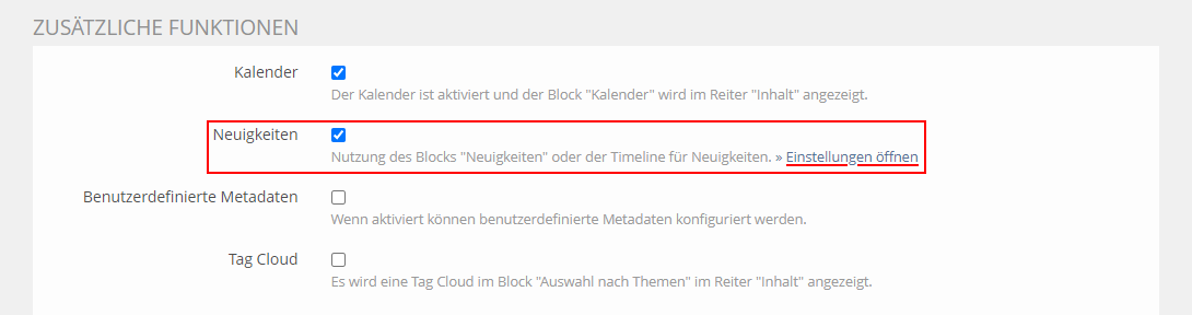 In den Einstellungen zu den Neuigkeiten, können Sie zwischen zwei Darstellungen wählen, einem "Neuigkeiten-Block" (engl. News Block) und der "Timeline"-Funktion.
