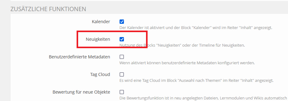 Damit Studierende über Neuigkeiten in Ihrem Kurs informiert werden, sobald Sie auf ihren persönlichen Schreibtisch schauen (in einem Block links neben den Kursen, in denen sie Mitglied sind) oder in der Neuigkeiten-Ansicht (Mein ILIAS > Neuigkeiten), müssen Sie in den Kurs-Einstellungen unter „zusätzliche Funktionen“ die Option „Neuigkeiten“ aktivieren. Dann haben Sie die Möglichkeit zwischen einem Neuigkeiten-Block und der Timeline-Funktion zu wählen.