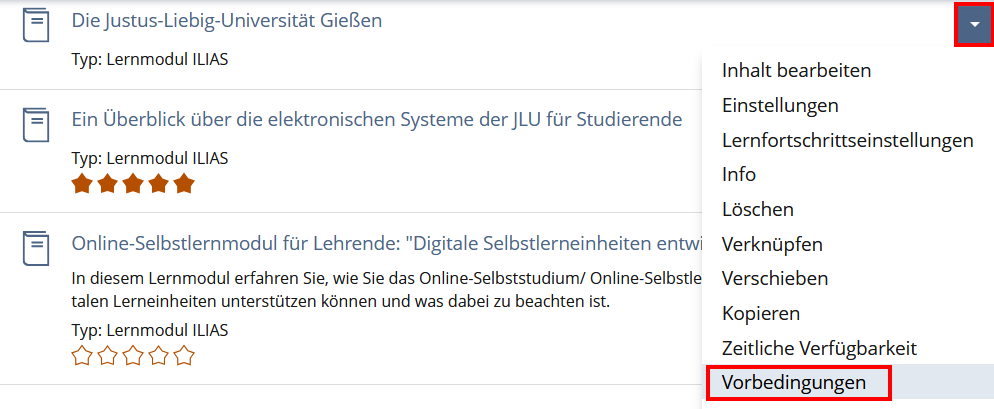 • Klicken Sie auf das Aktionsmenü zum Lernmodul (Dreieck rechts neben dem Objekt)