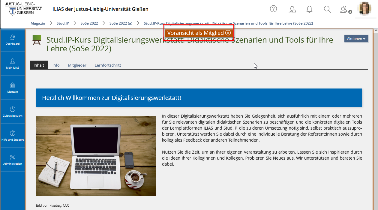 Wenn Sie prüfen wollen, was die Mitglieder in Ihrem Kurs genau sehen können / wie die Kursansicht für die Kursmitglieder ist, können Sie auf der Startseite Ihres ILIAS-Kurses die "Voransicht als Mitglied" aktivieren.