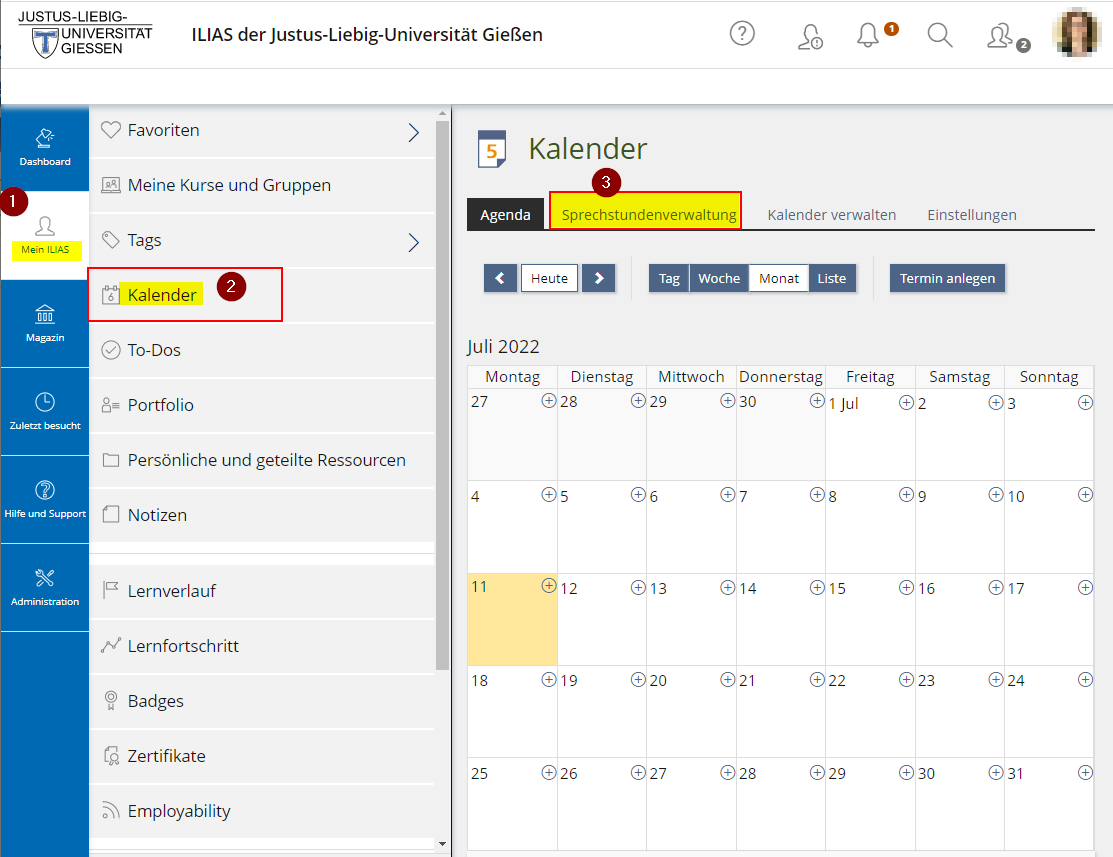 Sie haben in ILIAS die Möglichkeit, Ihre Sprechstunden zu verwalten. Gehen Sie hierzu auf den Bereich "Mein ILIAS" / "Kalender" / "Sprechstundenverwaltung".