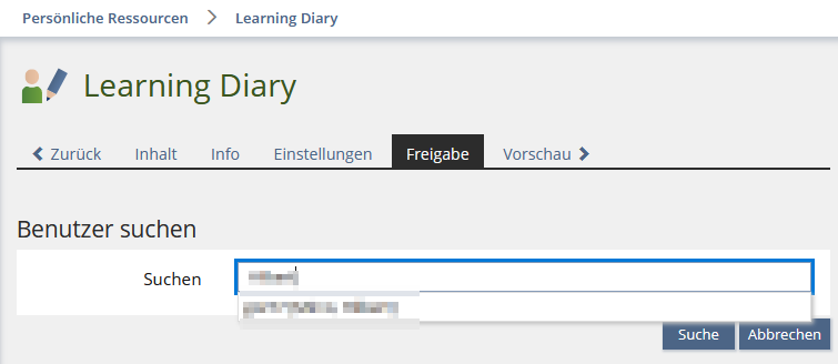 Ihnen werden jetzt Benutzer*innen angezeigt, die Ihren Suchkriterien entsprechen. Wenn Sie ein oder mehrere Benutzer*innen auswählen (Häkchen setzen) und dann auf den Button "Für Benutzer freigeben" klicken, haben Sie Ihre Ressource freigegeben.