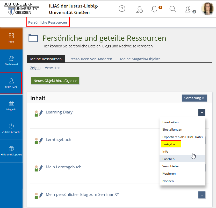 Gehen Sie zu dem Bereich in "Mein ILIAS", in dem Sie Ressourcen freigeben möchten (z.B. Portfolio oder "Persönliche und geteilte Ressourcen"). Klicken Sie neben dem Objekt, das Sie freigeben wollen, auf das Aktionsmenü und klicken dort auf "Freigabe".