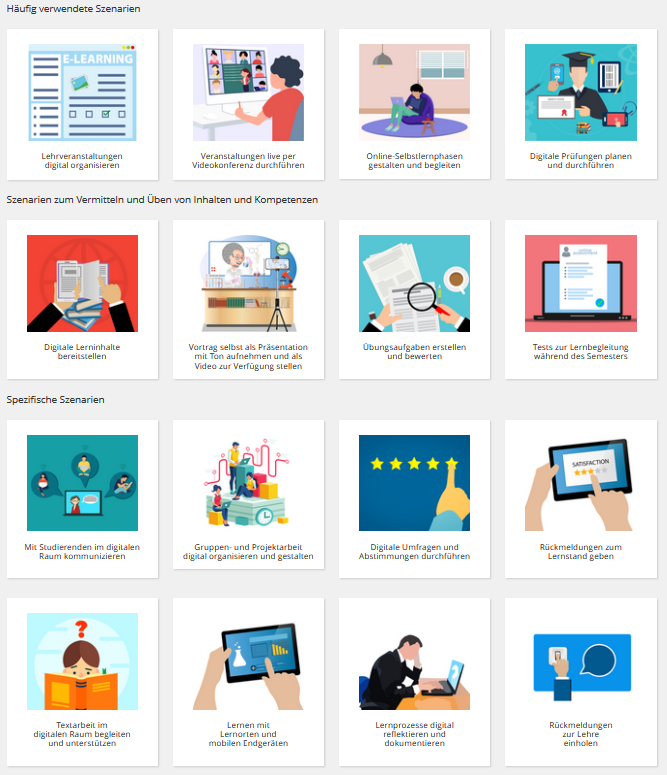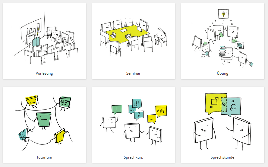 Die Seiten zu digitalen Umsetzungsmöglichkeiten für verschiedene Veranstaltungsformate enthalten eine Kurzinfo sowie eine Beschreibung der typischen didaktischen Lehr-Lernszenarien. Dabei wird Lehrenden eine Entscheidungshilfe gegeben, welches didaktische Szenario sich für welche Ziele und Rahmenbedingungen besonders gut eignet.