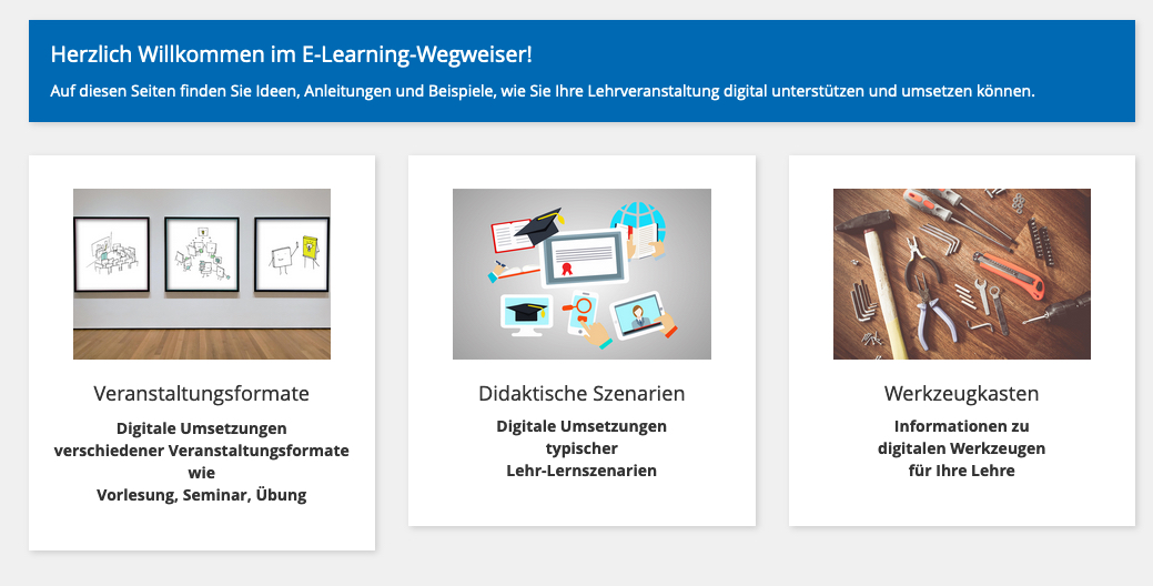 Der E-Learning-Wegweiser bündelt Informationen zu Möglichkeiten der digital gestützten Lehre an der JLU für Dozierende. Diese große Wissenssammlung besteht bereits einige Jahre. Mit dem kompletten Relaunch 2021 wurden neue Zugangswege in den Wegweiser geschaffen, die sich am Veranstaltungsformat (Seminar, Vorlesung, Übung, etc.) oder an didaktischen Szenarien (Prüfungen, Gruppenarbeiten, Rückmeldungen, Textarbeit, etc.) der Lehrveranstaltung orientieren.
