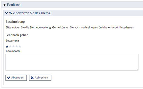 Feedback kann mit einer Fünf-Sterne-Benotung und/oder Kommentar eingerichtet werden.