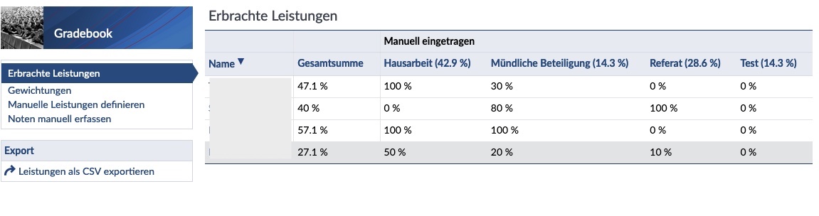 Stud.IP-Gradebook: Es handelt sich hierbei um eine Leistungsstand- und Fortschrittserfassung. Ein entsprechender Reiter "Gradebook" kann über die Auswahl "Mehr" in Veranstaltungen integriert werden. Hier können manuell Leistungen definiert werden.