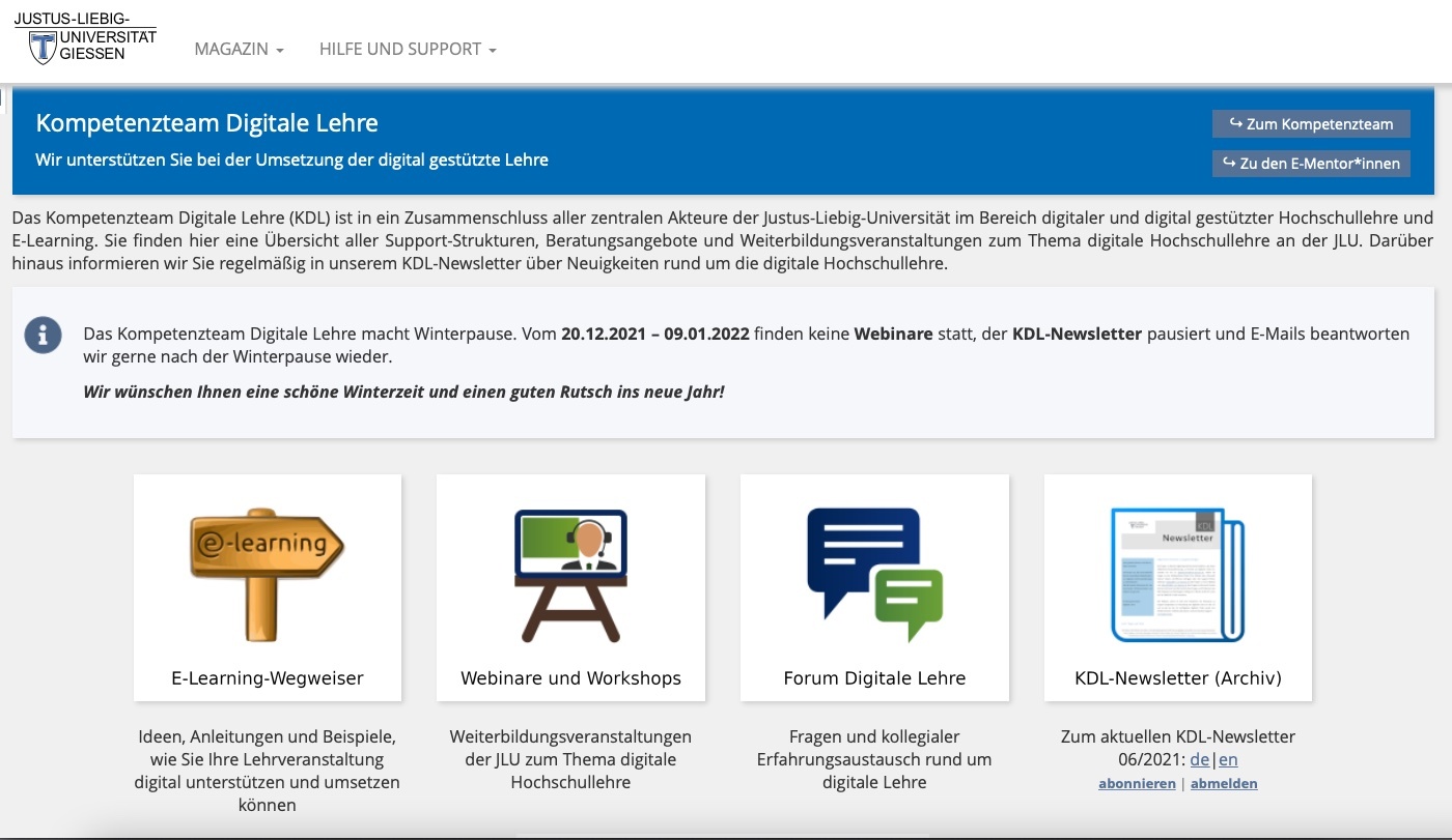 Um Informationen schneller auffindbar zu machen, wurde sich 2021 für den Relaunch der sogenannten „Pandemie-Seite“ entschieden. Aus „Lehren im Fall einer Pandemie“ wurde die Website des „Kompetenzteams Digitale Lehre“. Hier ist nun eine Übersicht aller Support-Strukturen, Beratungsangebote und Weiterbildungsveranstaltungen zum Thema digitale Hochschullehre an der JLU zu finden. Darüber hinaus informieren wir Sie regelmäßig in unserem KDL-Newsletter über Neuigkeiten rund um die digitale Hochschullehre.