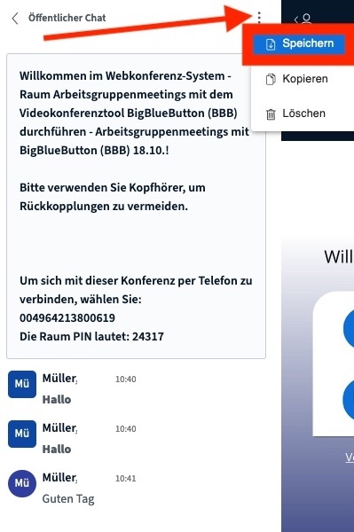 Der "öffentliche Chat" – aber auch jeder "private Chat" in BBB – lässt sich über das "Drei-Punkte-Menü" speichern (Abbildung 3). Es befindet sich über dem Chatfenster bzw. über dem Fenster mit der Willkommensnachricht und den Informationen zur Telefoneinwahl.