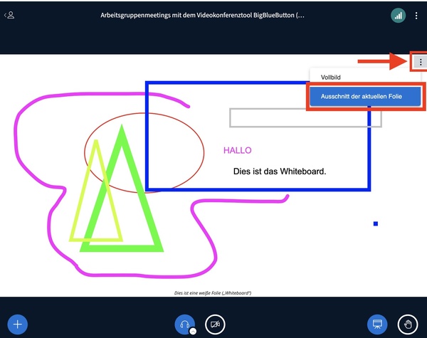 Sie können in BigBlueButton das Whiteboard selbst oder im Mehrbenutzermodus nutzen. Hinter der standardmäßig eingestellten Startfolie in jedem Meeting-Raum, befinden sich auf den weiteren "weiße" Folien, die Sie als Whiteboard nutzen können. Abspeichern lassen sich in BigBlueButton keine ganzen Foliensätze mit Notizen, sondern immer nur die aktuelle Folie. Klicken Sie dazu auf das "Drei-Punkte-Menü" in der rechten oberen Ecke der Folie (siehe roter Pfeil in Abbildung 4) und anschließend auf "Ausschnitt der aktuellen Folie". Die sichtbare Folie wird mit den Annotationen, Notizen oder Artefakten abgespeichert.
