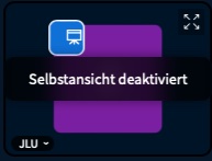 Die Selbstanzeige der Webcam kann deaktiviert werden. Wenn diese Ansicht deaktiviert, ist ein Bild von sich selbst nur mit einer Überlagerung zu sehen, die daran erinnert, dass die eigene Webcam noch aktiv ist und andere Sie sehen.