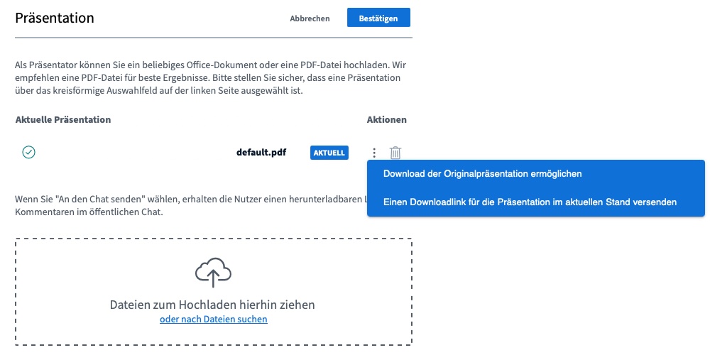 Mit BigBlueButton 2.7 ist sowohl das Herunterladen der gesamten Präsentation als auch das Herunterladen der Präsentation mit allen darin eingebetteten Anmerkungen möglich.