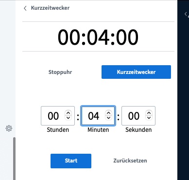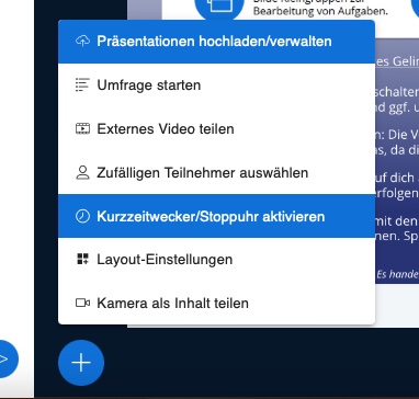 In der Sitzung ist es nun möglich, einen Countdown (Timer) oder eine Stoppuhr anzuzeigen. Sie werden allen Teilnehmenden angezeigt und es erfolgt eine akustische Benachrichtigung, wenn der Timer abläuft.