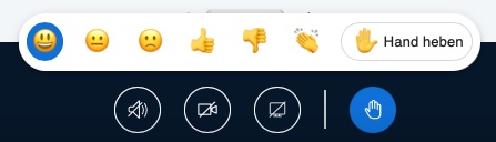 Die Reaktionsleiste soll es Teilnehmenden deutlich einfacher machen, mit Emojis zu antworten. Das Emoji wird eine Minute lang im Benutzer-Avatar-Bereich angezeigt (konfigurierbar). Die Leiste bleibt sichtbar, sobald sie aktiviert ist. Das ausgewählte Emoji bleibt solange sichtbar, bis die Zeit abgelaufen ist oder die Auswahl aufgehoben wird.