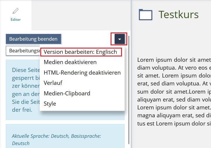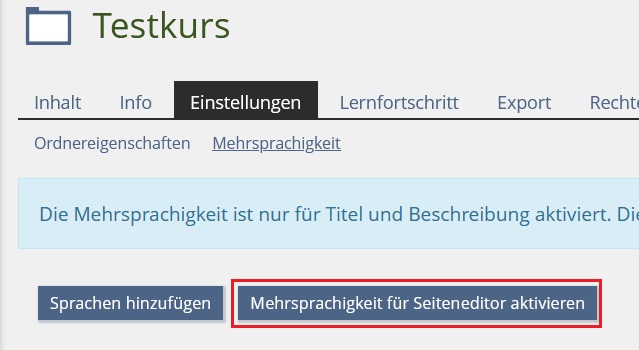 In einem weiteren Schritt kann man die Mehrsprachigkeit für den Seiteneditor aktivieren um Texte, die man eventuell auf einer Kursseite, einer Ordnerseite etc. platziert hat, in der Zielsprache anzeigen zu lassen.