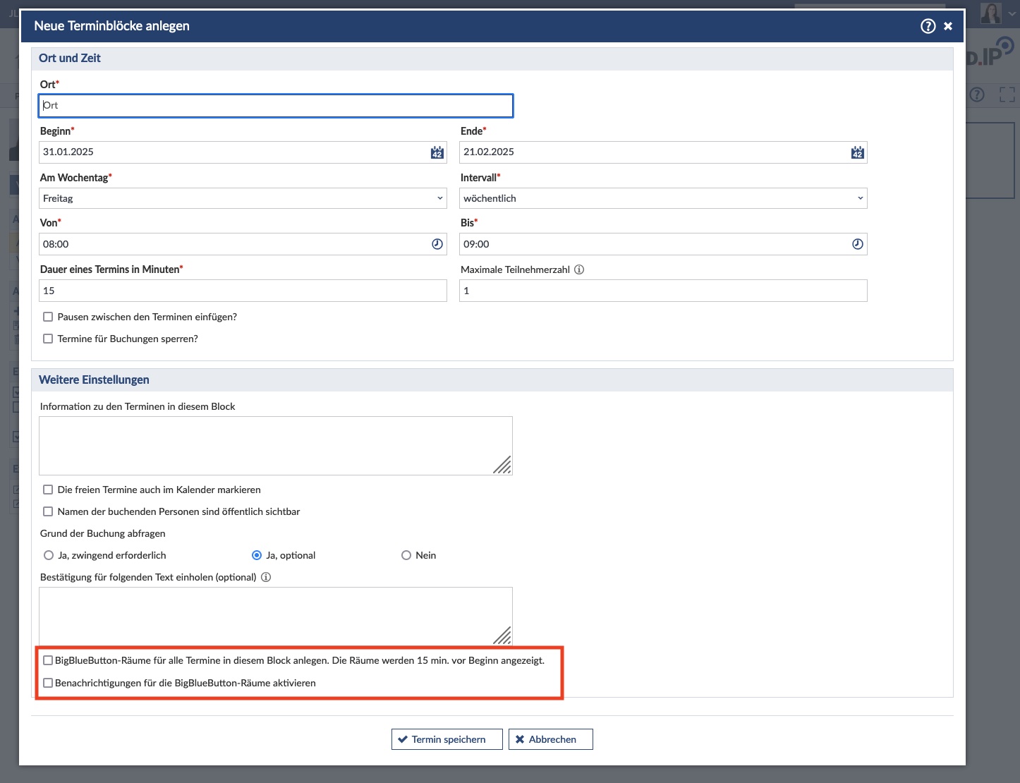 Aber auch in einer Veranstaltung können Sprechstunden ausschließlich für die Zielgruppe der Veranstaltung angeboten werden. Diese sind dann nicht mit der allgemeinen Sprechstundenfunktion gekoppelt.