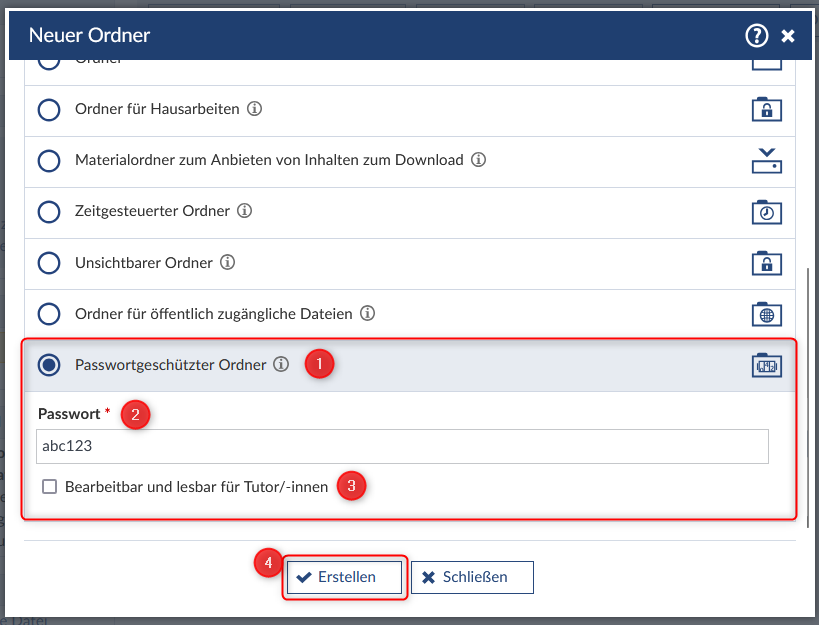- Wenn Sie die Rolle "dozent" haben, können Sie einstellen, ob die Tutorinnen und Tutoren diesen Bearbeitungszugriff auf den Ordner auch ohne Passworteingabe haben (3).