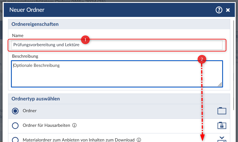 Den Ordnertyp "Passwortgeschützter Ordner" finden Sie ganz am Ende der Typen-Liste. Scrollen Sie dazu ganz nach unten (2).