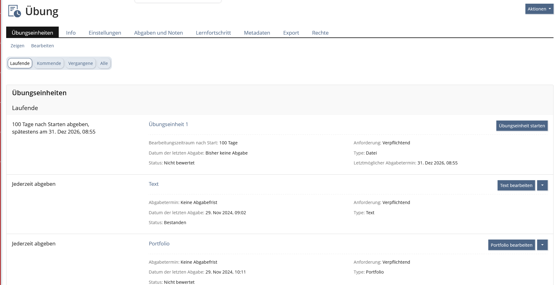 - Übersichtliche Übungen: Neue Buttons und eine klare Struktur führen Teilnehmende gezielt durch die Aufgaben. Lehrende können mehrere Einreichungen gleichzeitig bewerten – effizient und zeitsparend!