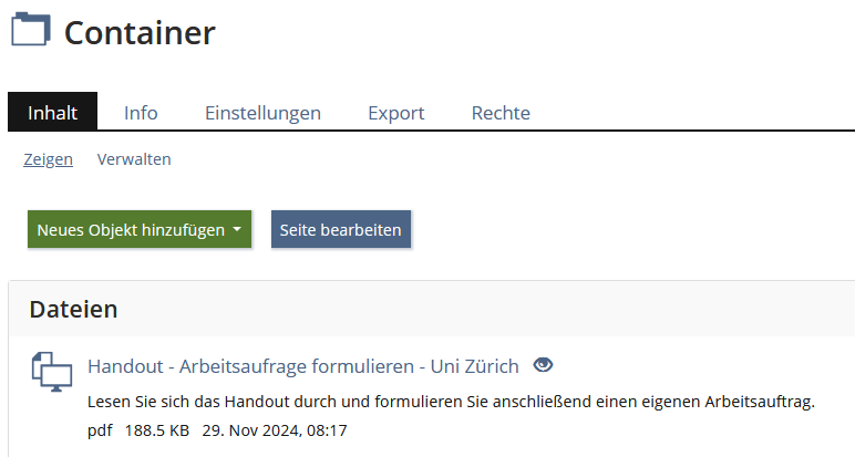 - Zusätzliche Informationen: Geben Sie Studierenden Hinweise zur Datei (z.B. eine Arbeitsanweisung, mit welchem Arbeitsauftrag Sie einen Text lesen sollen), bevor diese heruntergeladen wird. Zusätzlich können Sie Lizenzinformationen festlegen und die Anzahl der Downloads verfolgen.