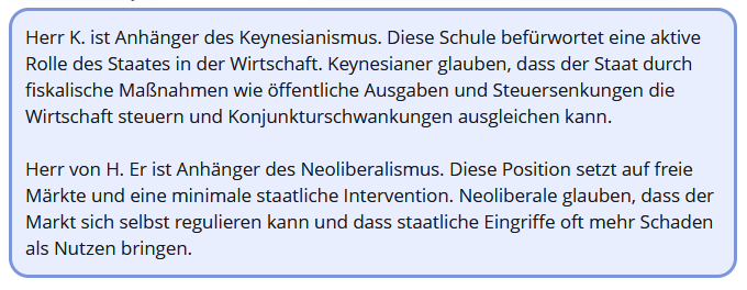 HinweisHerr K. ist Anhänger des Keynesianismus. Diese Schule befürwortet eine aktive Rolle des Staates in der Wirtschaft. Keynesianer glauben, dass der Staat durch fiskalische Maßnahmen wie öffentliche Ausgaben und Steuersenkungen die Wirtschaft steuern und Konjunkturschwankungen ausgleichen kann.