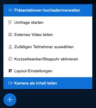 Beim hybriden Lernen besteht häufig die Notwendigkeit, ein Whiteboard im Raum oder einen bestimmten physischen Gegenstand zu zeigen. Die Verwendung einer Webcam als Hauptinhalt im Präsentationsbereich wird nun bereit gestellt (siehe Screenshot). Diese Funktion ist über den "+"-Button aufrufbar, über den Sie auch Ihre Präsentationen hochladen.