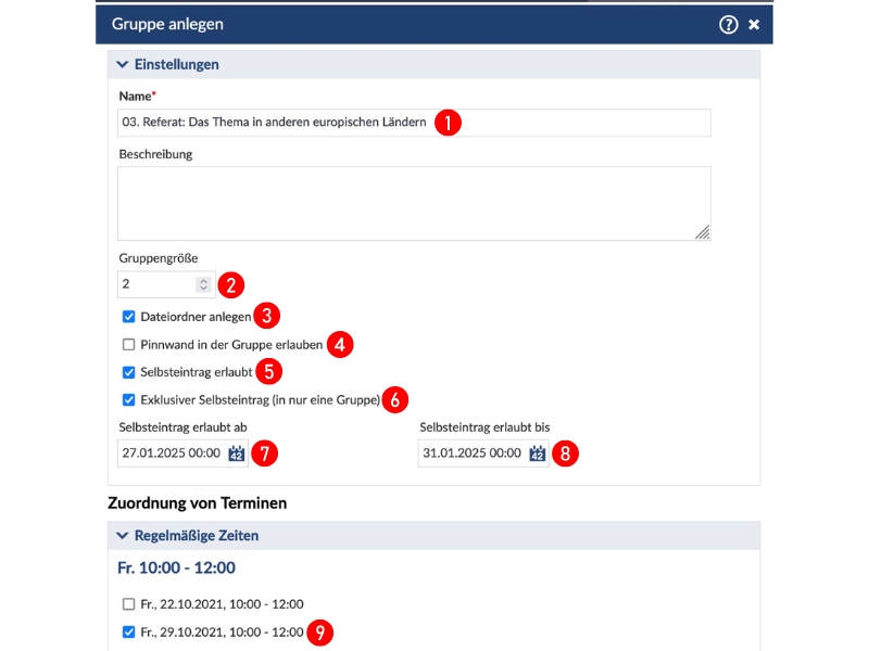 - Wenn sich ein Studierender nur in eine Gruppe eintragen soll, aktivieren Sie "exklusiver Selbsteintrag"