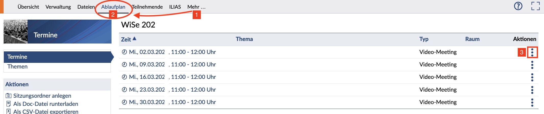 Über "Mehr..." (1) in der Reiternavigation können Sie als Dozierende den Ablaufplan (2) in ihrer Veranstaltung freischalten. Unter dem Drei-Punkt-Aktionsmenü (3) finden Sie die Möglichkeiten: