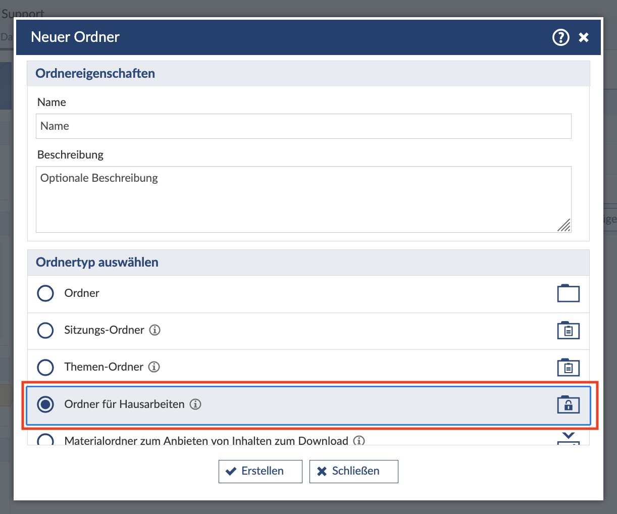 Den Ordnertyp "Passwortgeschützter Ordner" finden Sie ganz am Ende der Typen-Liste. Scrollen Sie dazu ganz nach unten (2).