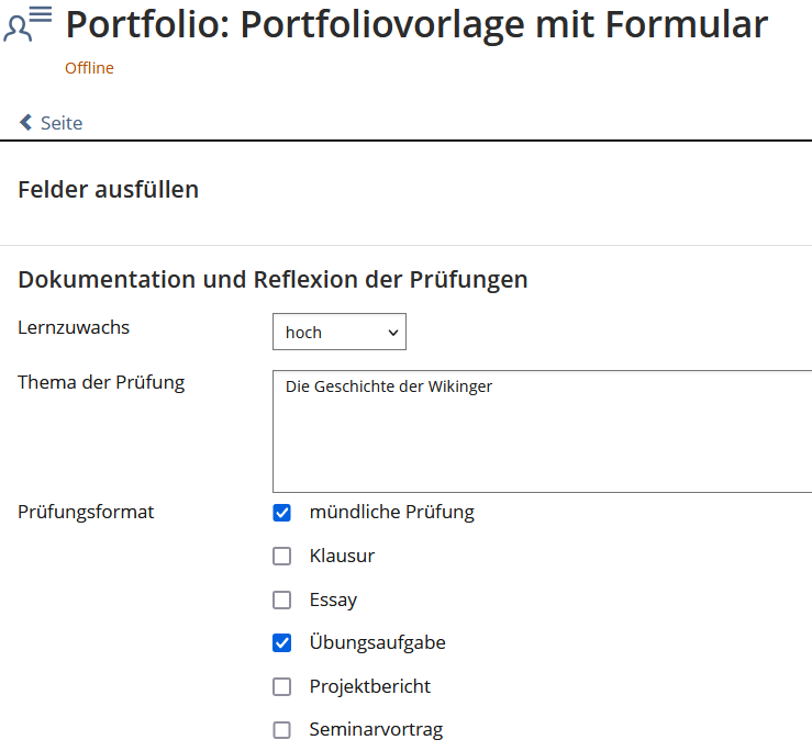 - Formulare in Portfolios: Bauen Sie Metadaten-Felder in Portfoliovorlagen ein, um strukturierte und ausfüllbare Bereiche zu schaffen – ideal für standardisierte Rückmeldungen oder Lernprotokolle.