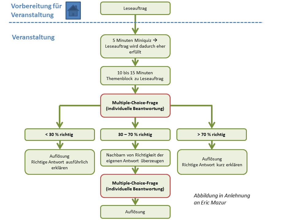 Das „Peer Instruction“ Konzept wurde von Eric Mazur (Professor der Universität Harvard) Anfang der 90er Jahre entwickelt. Die theoretische Wissensvermittlung findet zuhause statt, Studierende bereiten Text vor und setzen diesen in der Veranstaltung mit praktischen Beobachtungen in Beziehung. Dabei kommt auch ein Abstimmungssystem zum Einsatz.