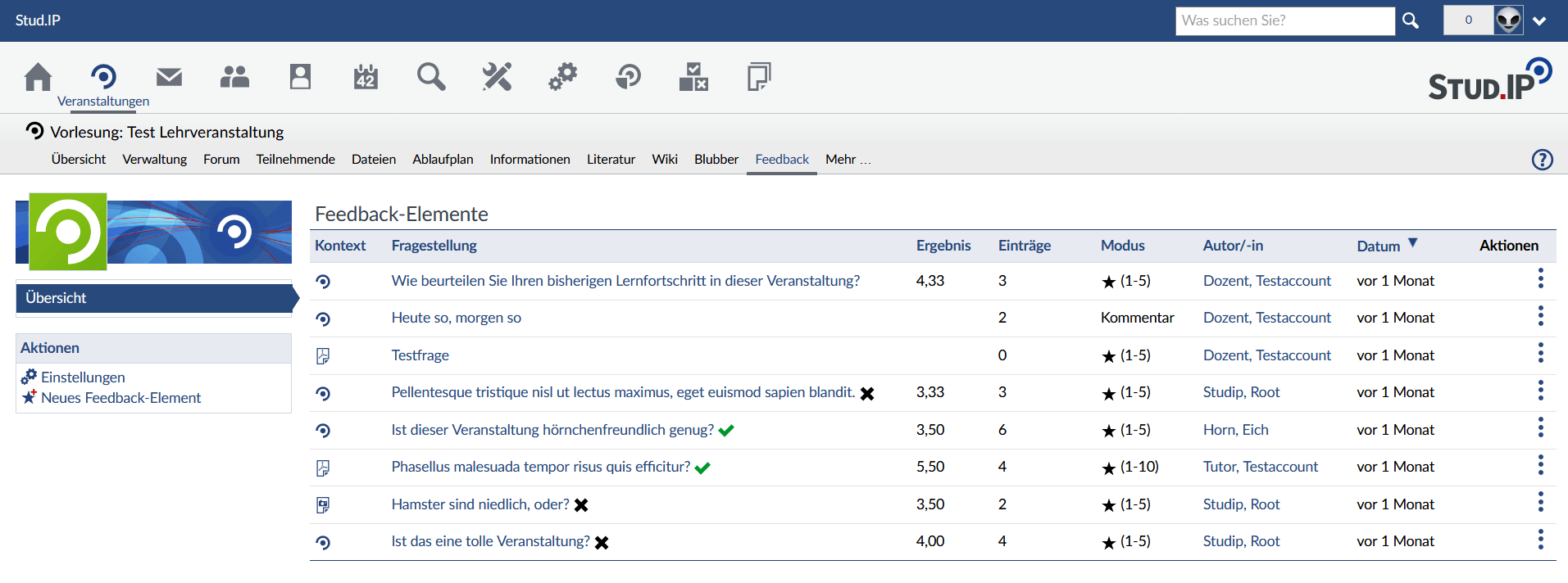 Mit diesem Element ist es möglich, in Stud.IP innerhalb von Veranstaltungen an verschiedenen Stellen Feedback einzuholen, z. B. in der Veranstaltungsübersicht oder im Dateibereich. Das Plugin ist über den "Mehr"-Reiter aktivierbar. Über "Einstellungen" kann man anschließend festlegen, ob die Funktion ab Status "Studierende", "Tutoren" oder "Dozierende" nutzbar sein soll.