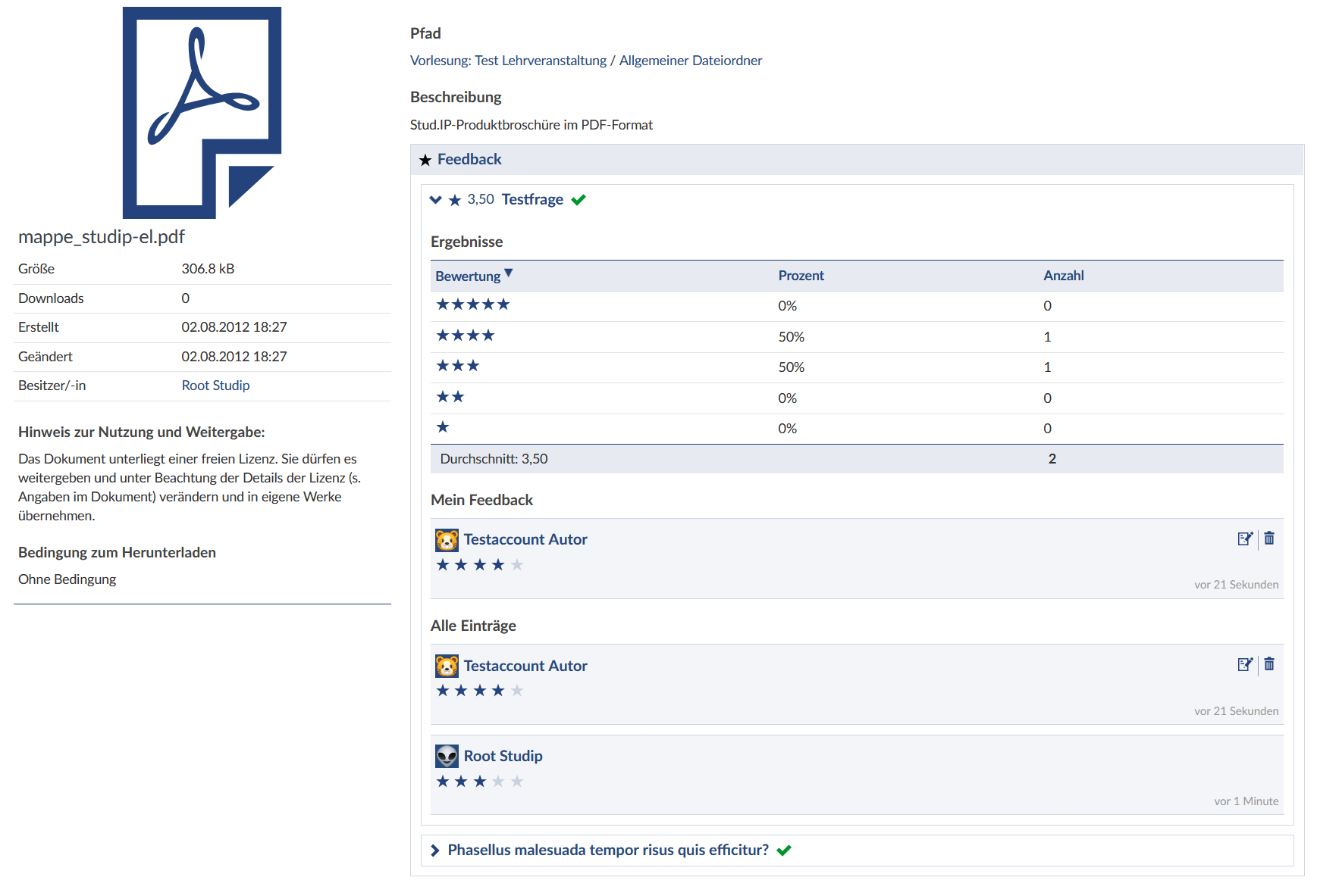 Mit diesem Element ist es möglich, in Stud.IP innerhalb von Veranstaltungen an verschiedenen Stellen Feedback einzuholen, z. B. in der Veranstaltungsübersicht oder im Dateibereich. Das Plugin ist über den "Mehr"-Reiter aktivierbar. Über "Einstellungen" kann man anschließend festlegen, ob die Funktion ab Status "Studierende", "Tutoren" oder "Dozierende" nutzbar sein soll.