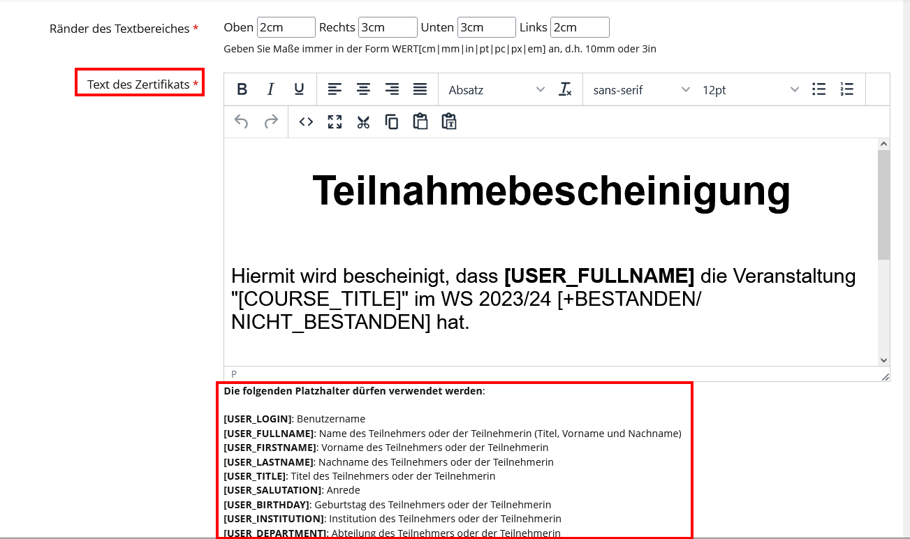 Schritt 2: Bereiten Sie das Zertifikat vor, indem Sie den Text mit Platzhaltern erstellen, das Format der Bescheinigung sowie die Seitenränder einstellen und ggf. ein Hintergrundbild mit digitaler Unterschrift und Logo der JLU hochladen.