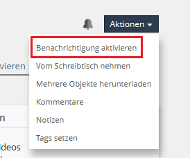 Studierende können sich für viele ILIAS-Objekte per Mail über Neuigkeiten benachrichtigen lassen (z. B. einen neuen Foren-Eintrag oder einen neuen Wiki-Eintrag). Dazu müssen sie über die Schaltfläche „Aktionen“ oben rechts im jeweiligen Objekt „Benachrichtigungen aktivieren“ auswählen. Diese Möglichkeit gibt es für die ILIAS-Objekte Kurs, Gruppe, Buchungspool, Forum, Wiki, Blog und Datensammlung. In Datensammlungen muss die Benachrichtigungsoption von Ihnen zunächst aktiviert werden (über die Einstellungen des Objekts), bei allen anderen genannten Objekten ist sie standardmäßig vorhanden.
