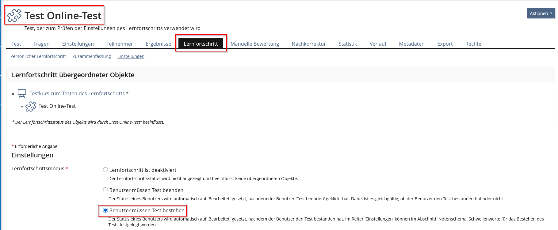Hinweis: Die möglichen Werte des Lernfortschrittsmodus sind bei den ILIAS-Objekten sehr unterschiedlich. Beim ILIAS-Lernmodul gibt es z.B. den Lernfortschrittsmodus " Mindestlerndauer für gesamtes Lernmodul", "Alle Fragen richtig beantwortet" oder "Besuchte Seiten", während es beim Test die Einstellungen "Benutzer müssen Test beenden" oder "Benutzer müssen Test bestehen" gibt.